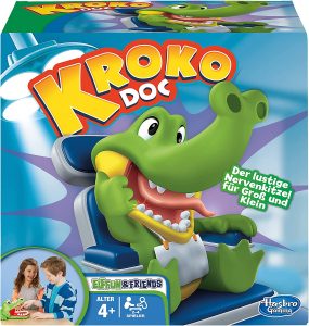 Aber Vorsicht: Erwischt man das Krokodil auf dem falschen Zahn, dann schnappt es blitzschnell zu. Wer zu langsam ist, der hat der verloren. Der letzte Mitspieler hat am Ende gewonnen. Ein tolles Spiel, bei dem natürlich alles sehr sanft vonstattengeht. Echte Schmerzen wird das Krokodil nicht verursachen. Hasbro selbst gibt für Krokodoc ein Mindestalter von 4 Jahren an. Das scheint angemessen.