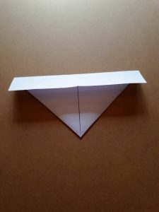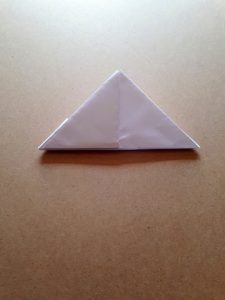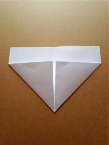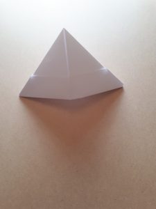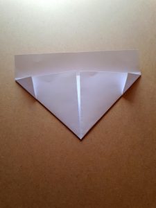 Schritt 13: Jetzt nimmt ihr wieder die gleichen Spitzen und falten sie von innen nach außen auf die obere Spitze. Ihr habt nun wieder ein Dreieck als Form, das wieder an einen kleinen Hut erinnert.